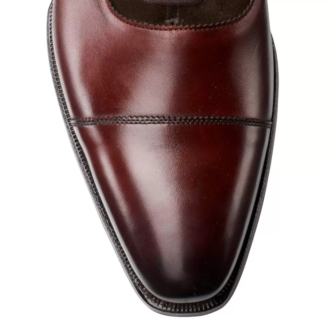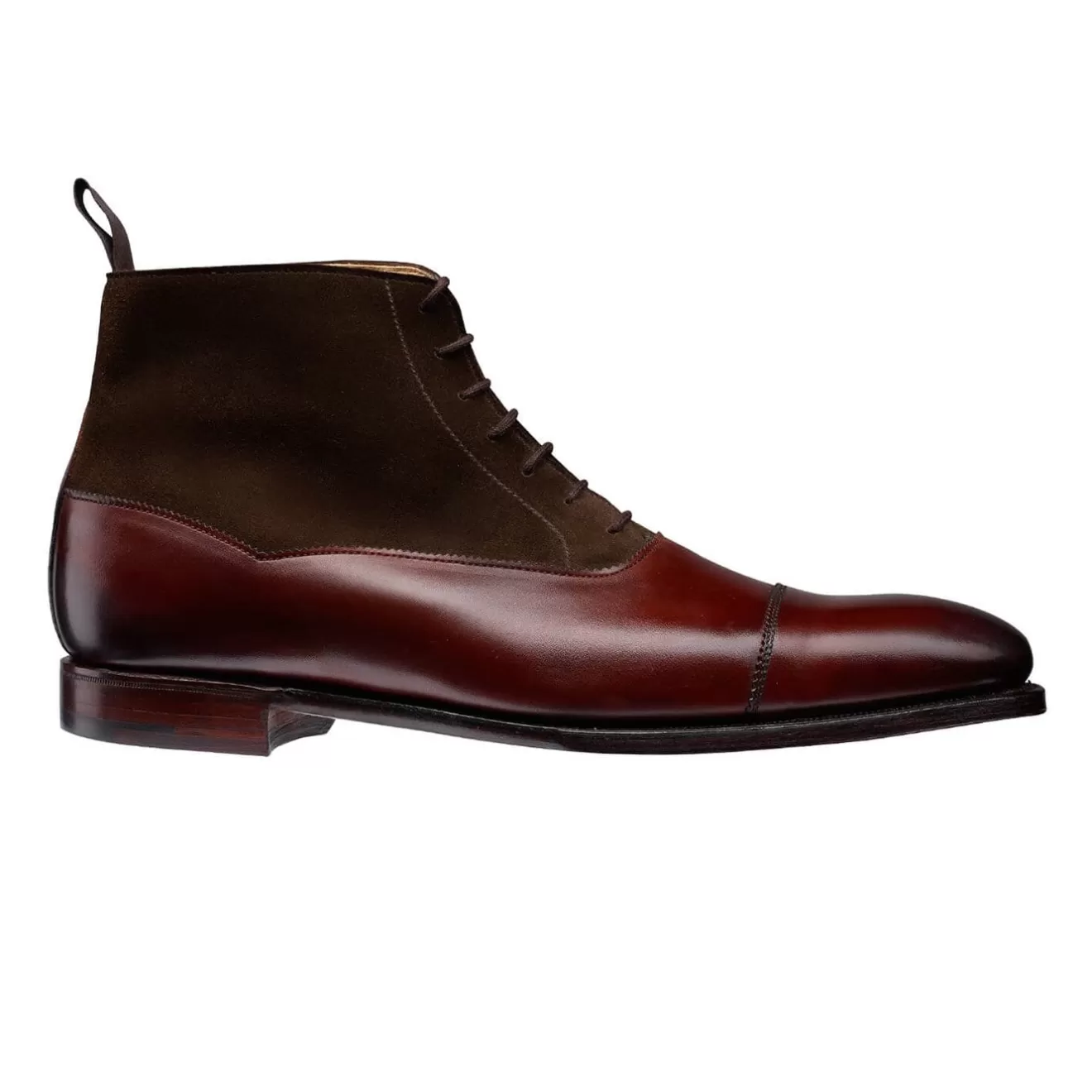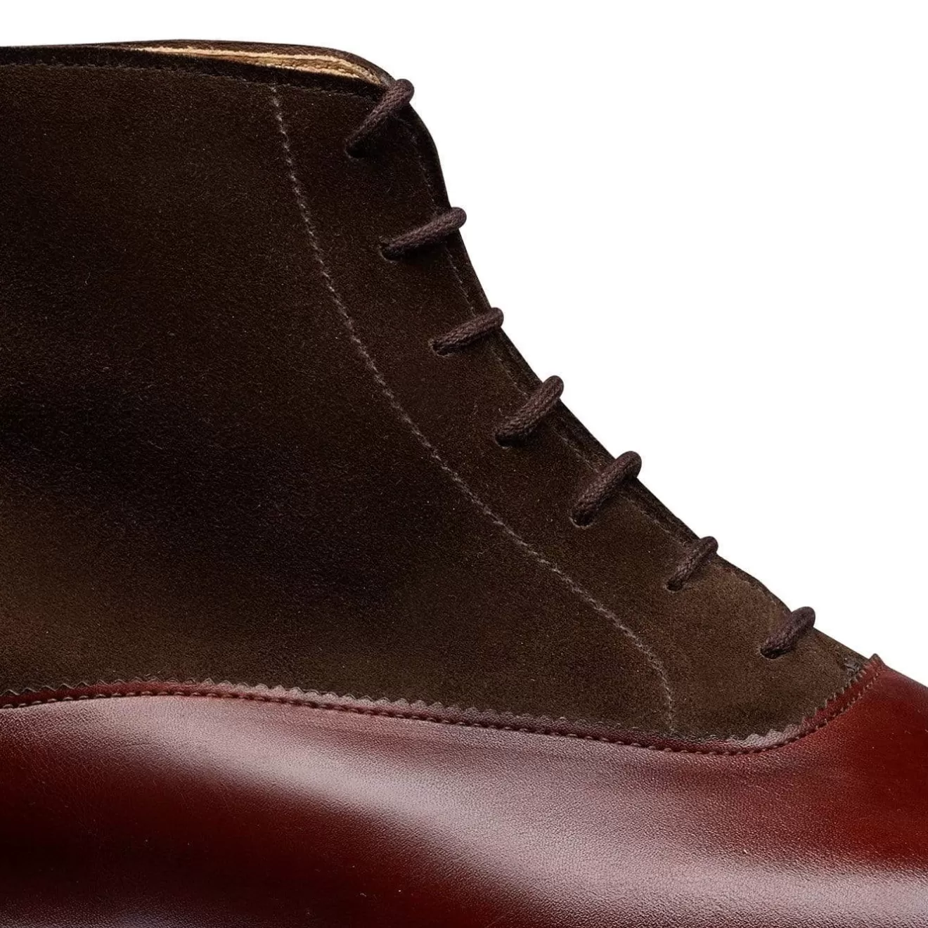 Charlton, a Balmoral boot with a straight toe cap, hand polished with exaggerated hand burnishing. Made from the finest chestnut antique calf and dark brown calf suede leather with bark tanned single leather soles. From the Hand Grade Collection.