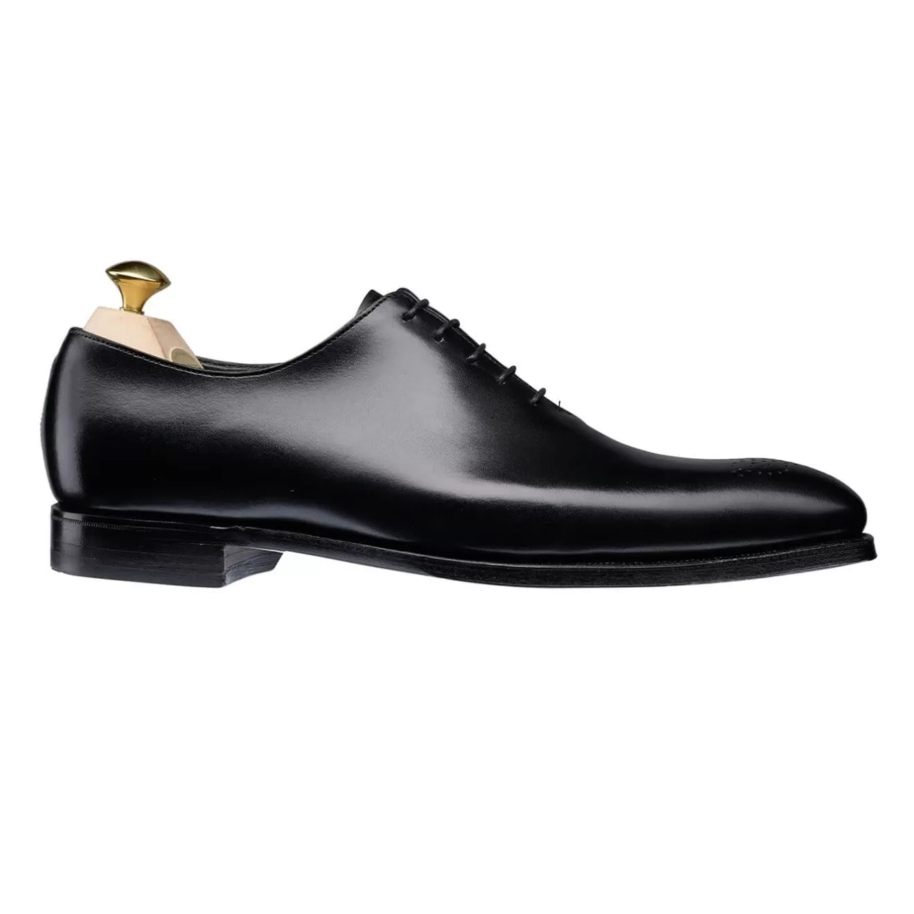Weymouth 2, a wholecut shoe with a lightly punched medallion design on the toe. Made from the finest black calf with bark tanned leather soles. From the Hand Grade collection.
