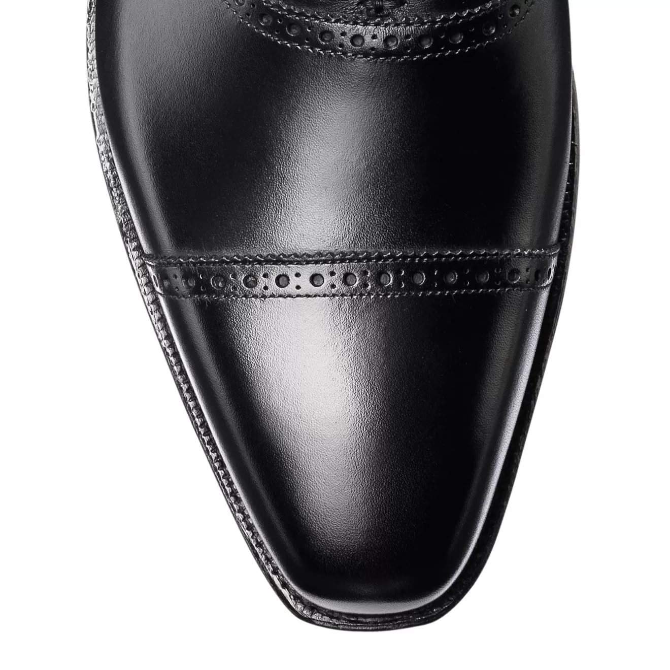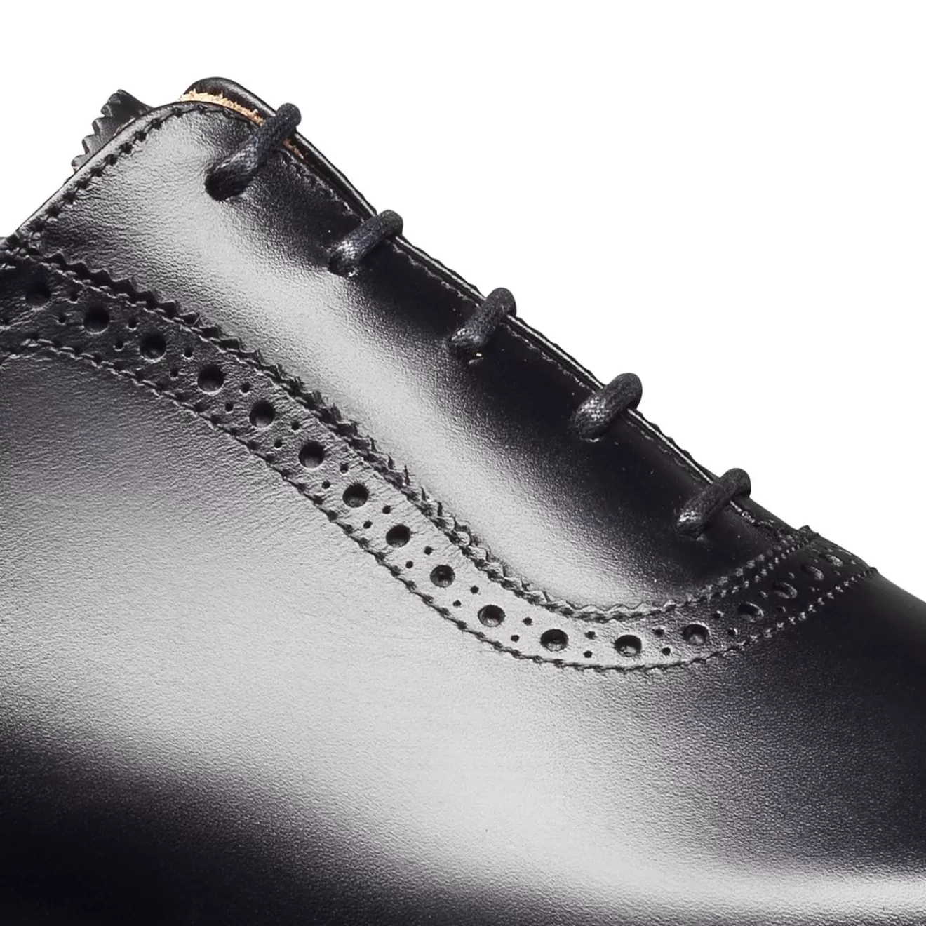 Westbourne, an oxford shoe with a u-throat and punched toe cap. Made from the finest black calf leather with single leather soles. From the Men’s Main Collection.