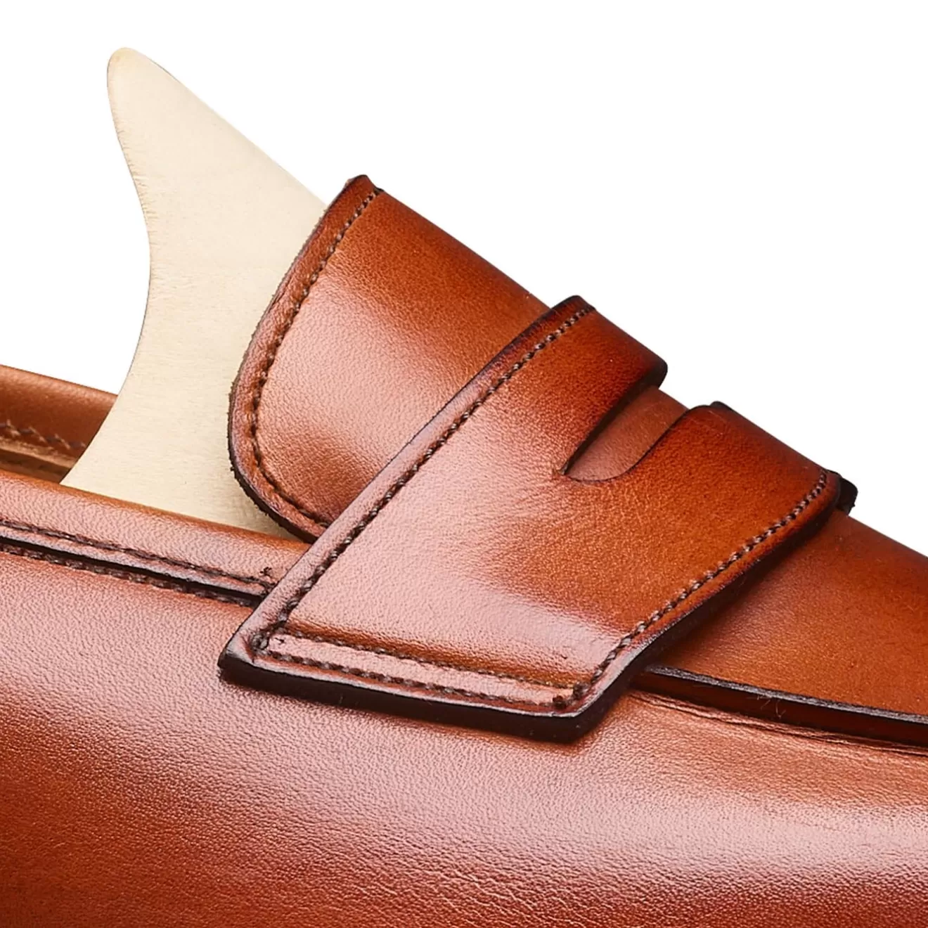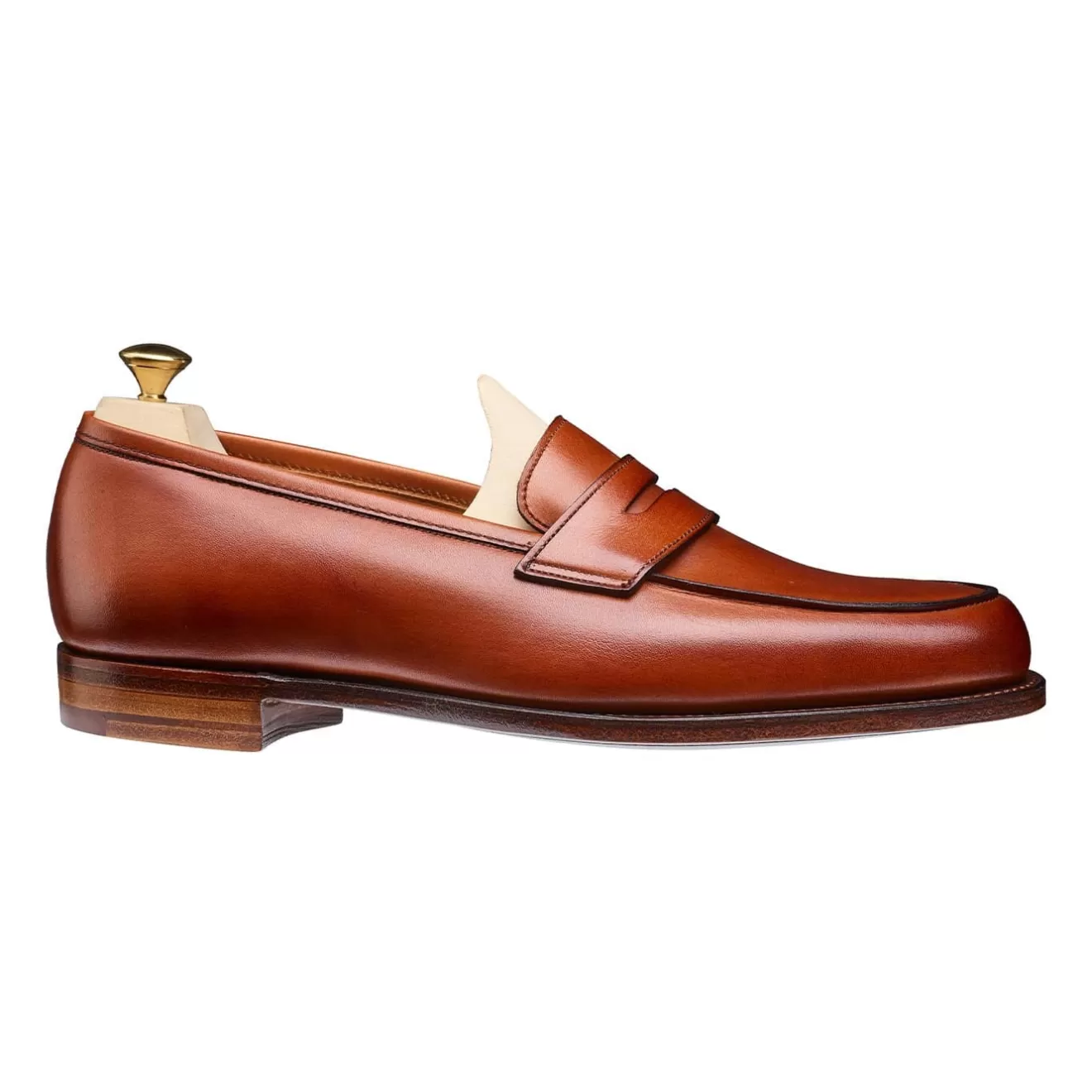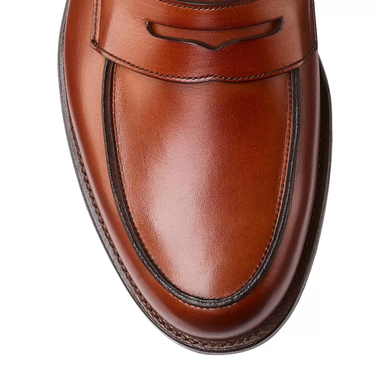 Elise, a penny loafer with butted seam apron, made from the finest chestnut burnished calf leather and SUPERFLEX leather soles. From the Women’s Collection.