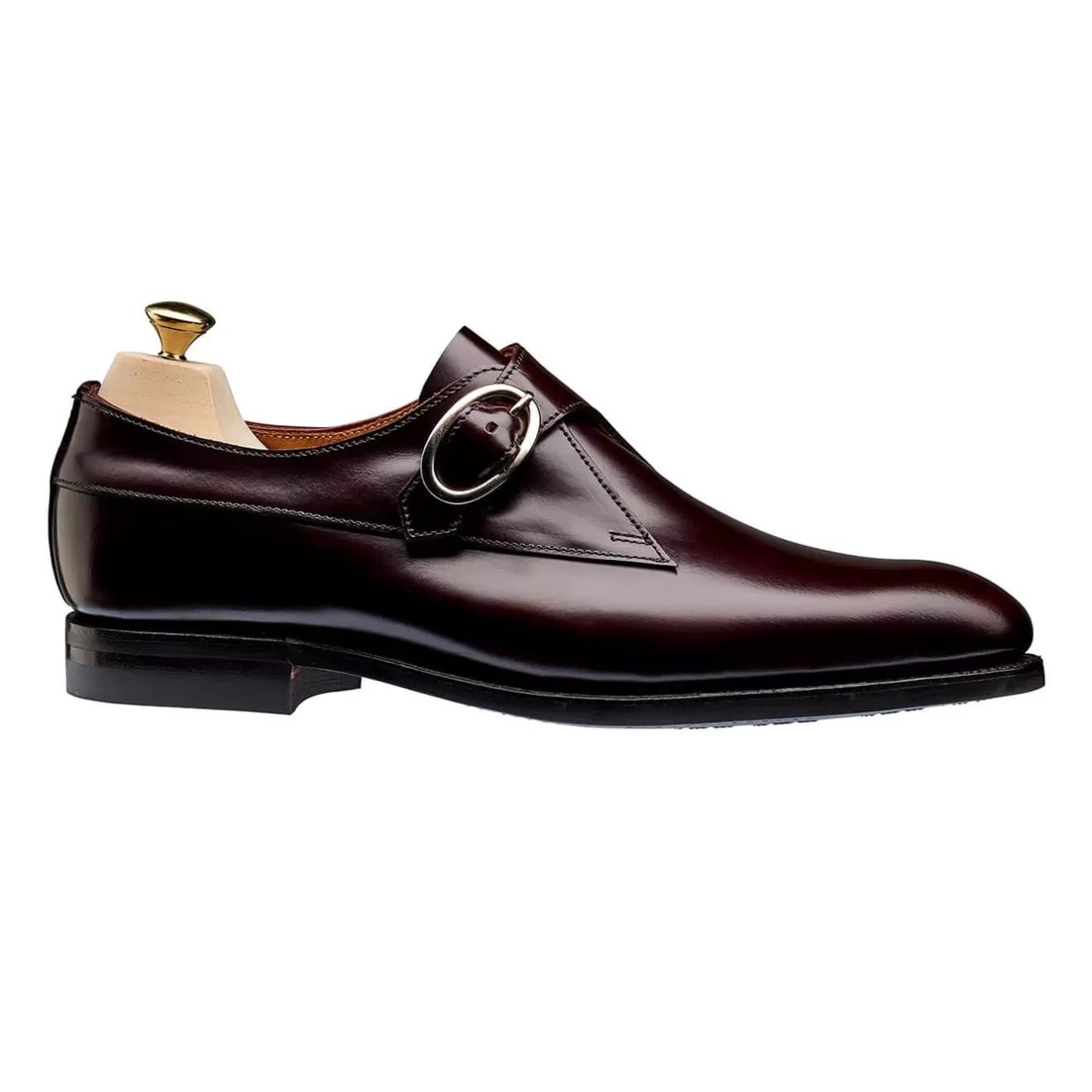 Emily, a plain fronted monk shoe with a single hand finished buckle. Taking inspiration from Lisa with its sharp side detailing, this single buckle is a first for the Crockett & Jones Women’s Collection. Made using the finest burgundy cavalry calf with our ‘City’ rubber sole. From the Women’s Collection.