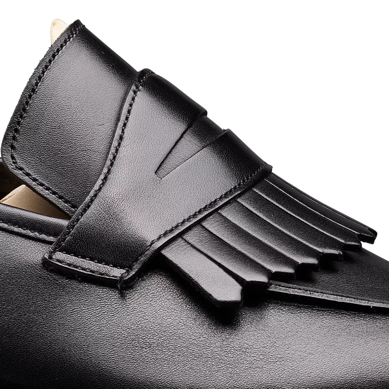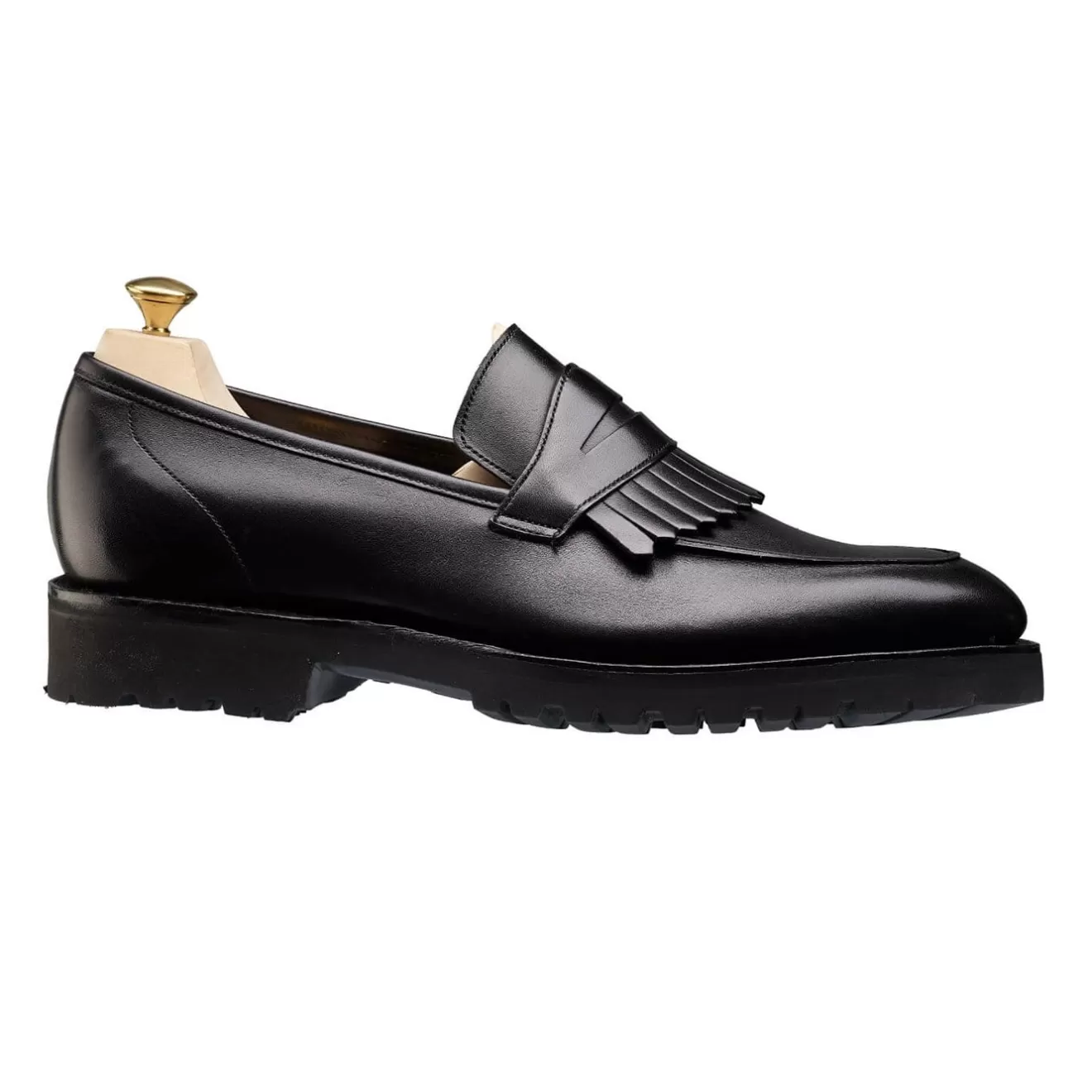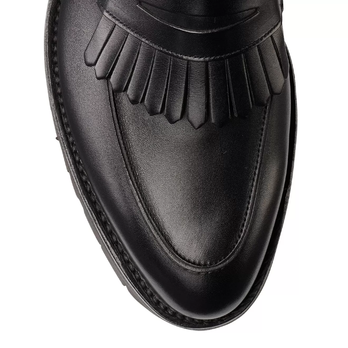 Julia, an unlined, apron penny loafer with a feminine fringe underlay. Made from the finest black calf with an oversized lightweight cleated sole. From the Women’s Collection.