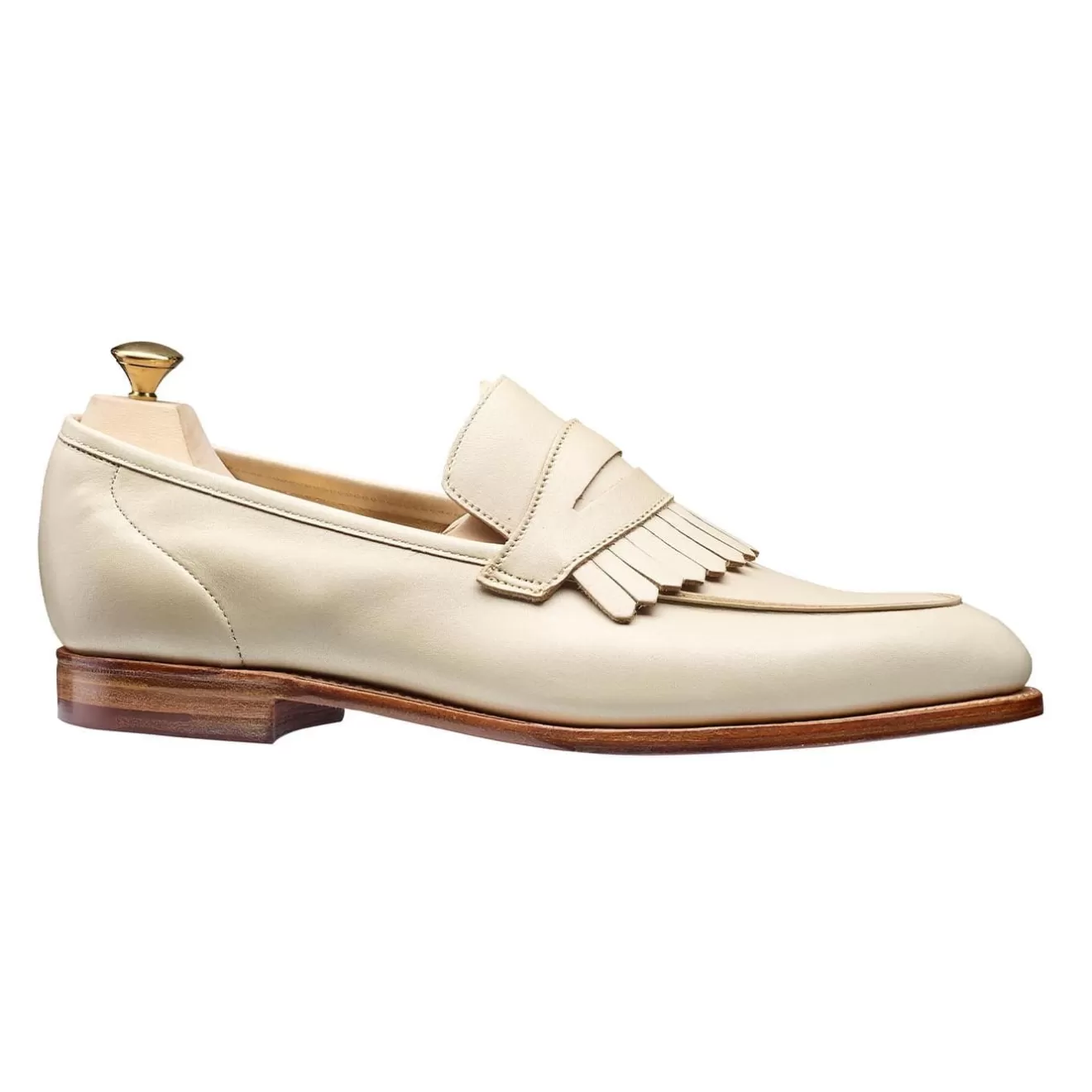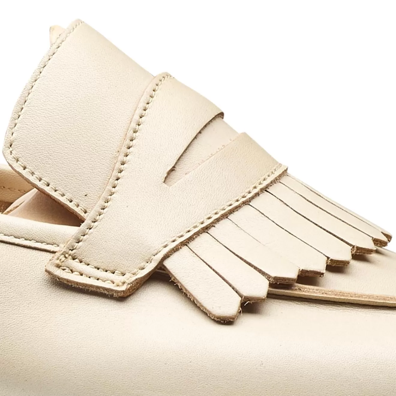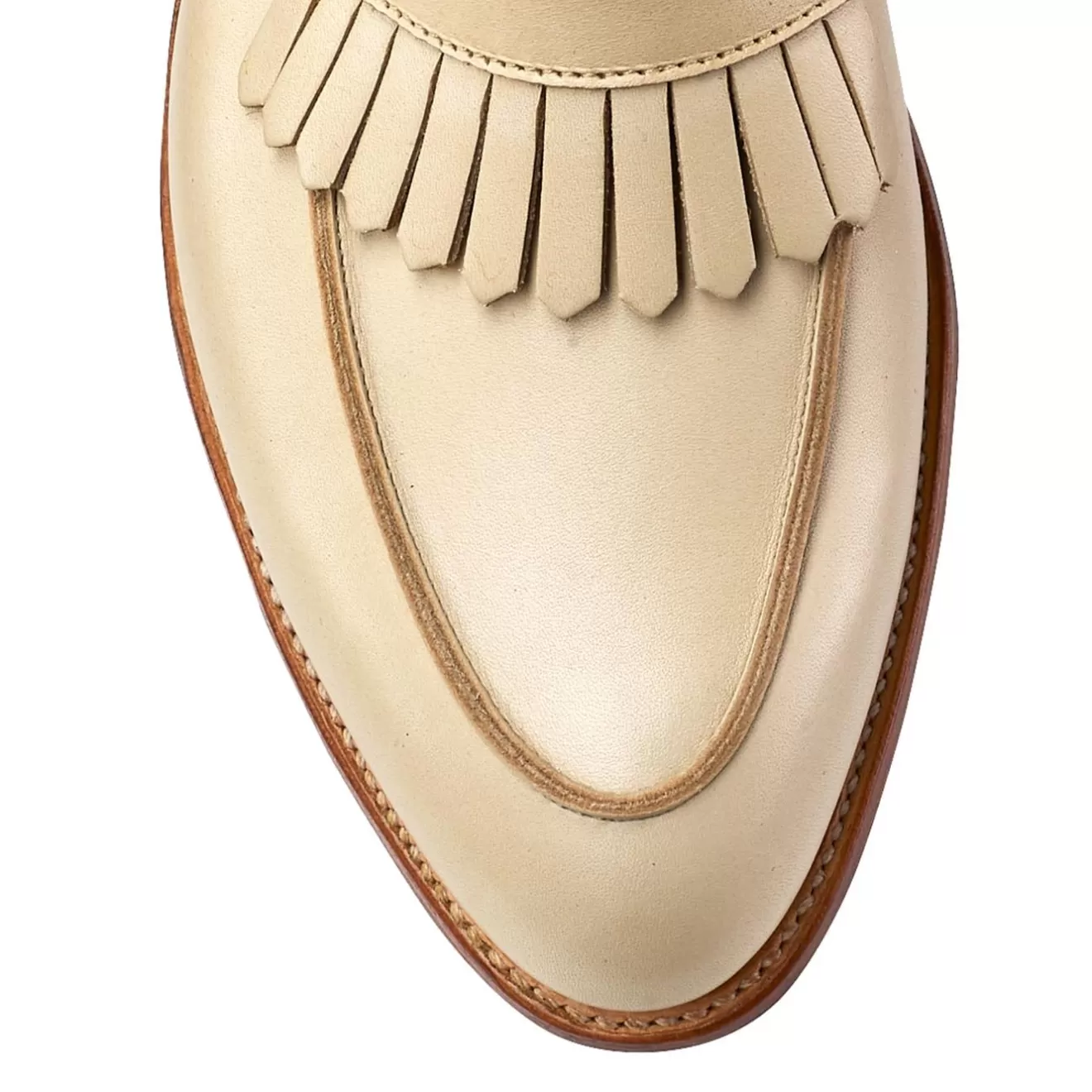 Julia, an unlined, apron penny loafer with a feminine fringe underlay. Made from the finest Ecru Calf with a single leather sole. From the Women’s Collection.