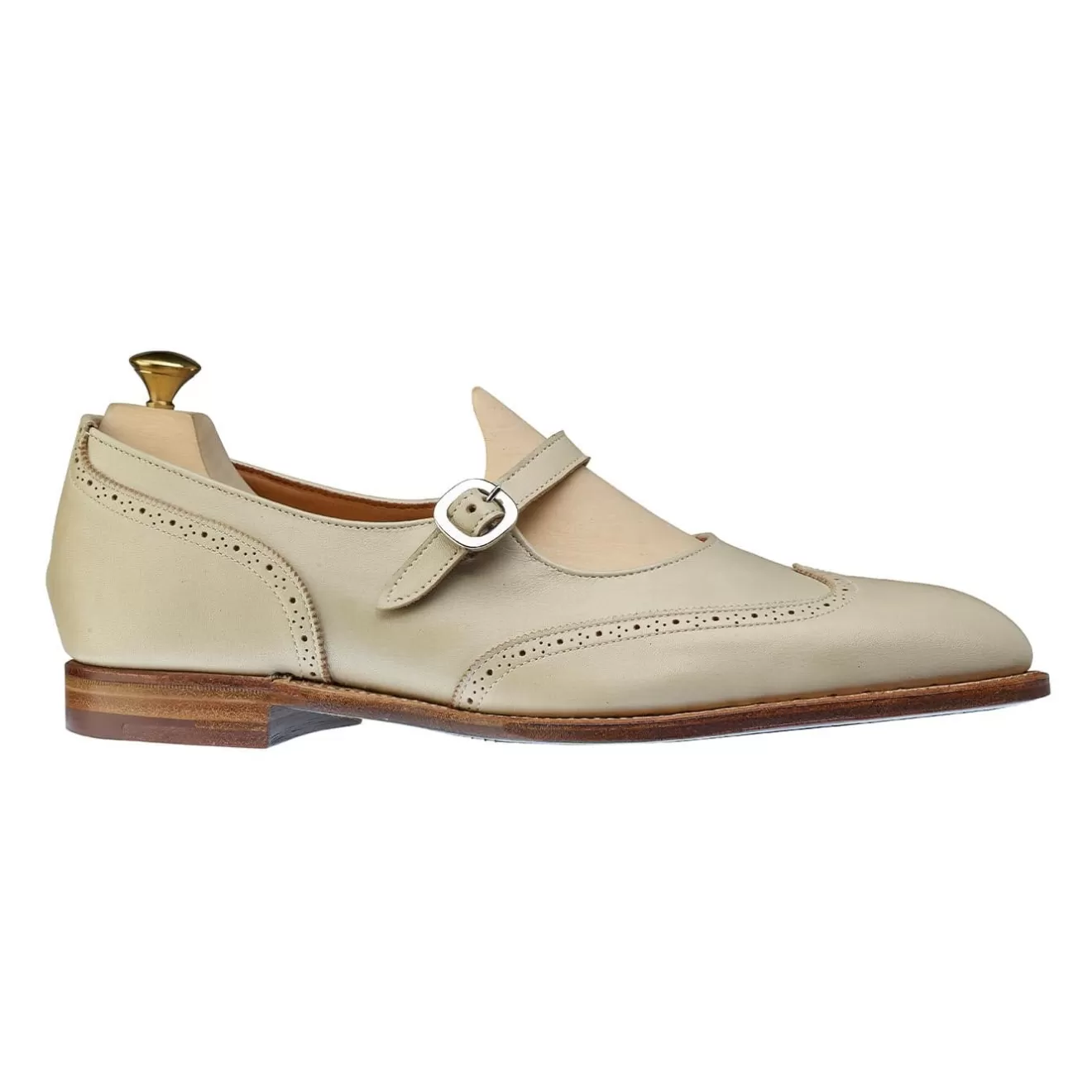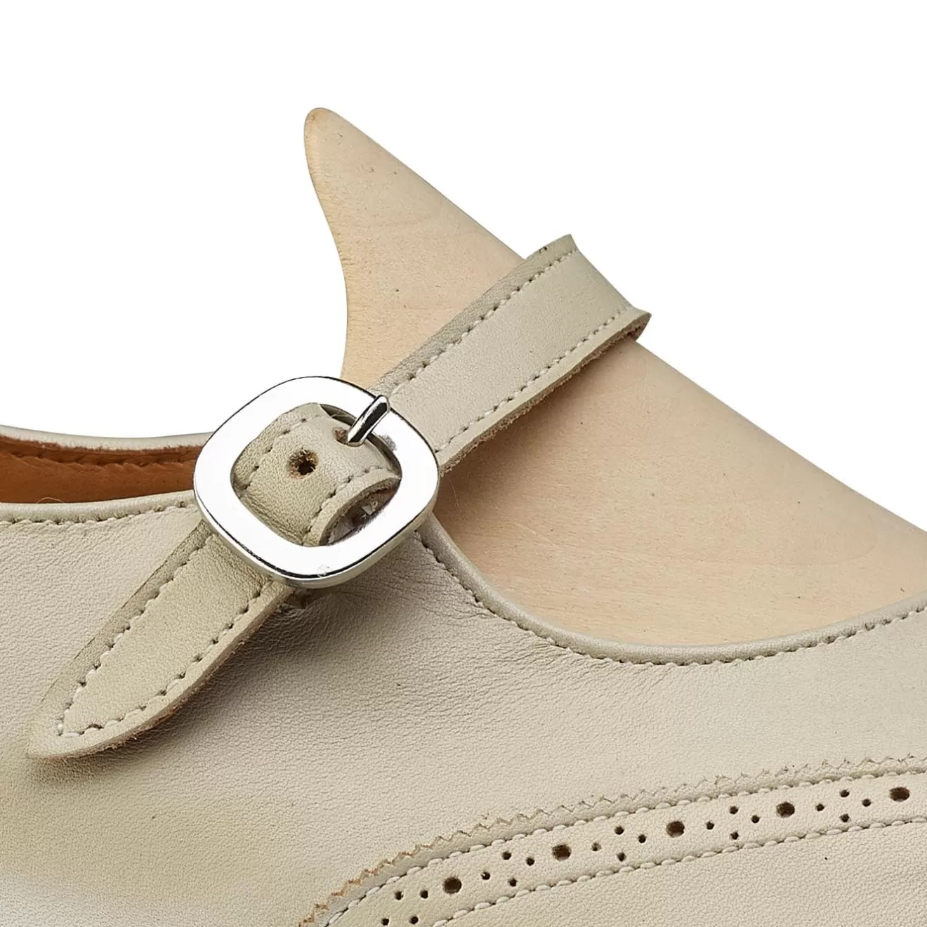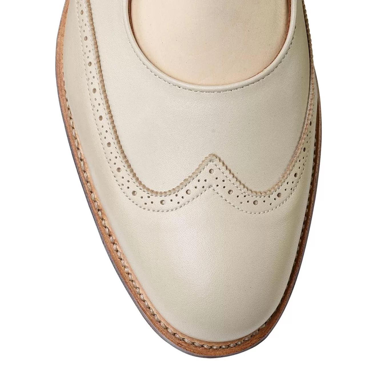 Mary, a single buckle Mary Jane style with a brogue wing tip design. Made from the finest ivory calf leather with single leather soles. From the Women’s Collection.
