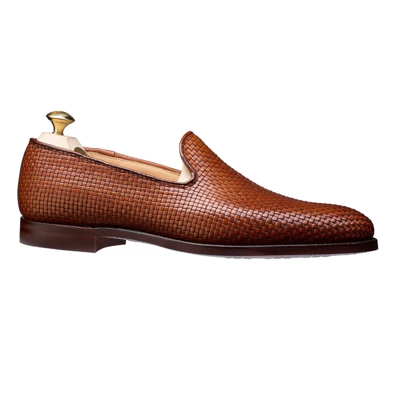 Kensington, an albert slipper style with plain front offering a clean, uncompromised loafer. This style is perfect for day wear or formal evening wear. Made from the finest tan woven calf leather with our Chocolate ‘City’ rubber sole. From the Men’s Main Collection.
