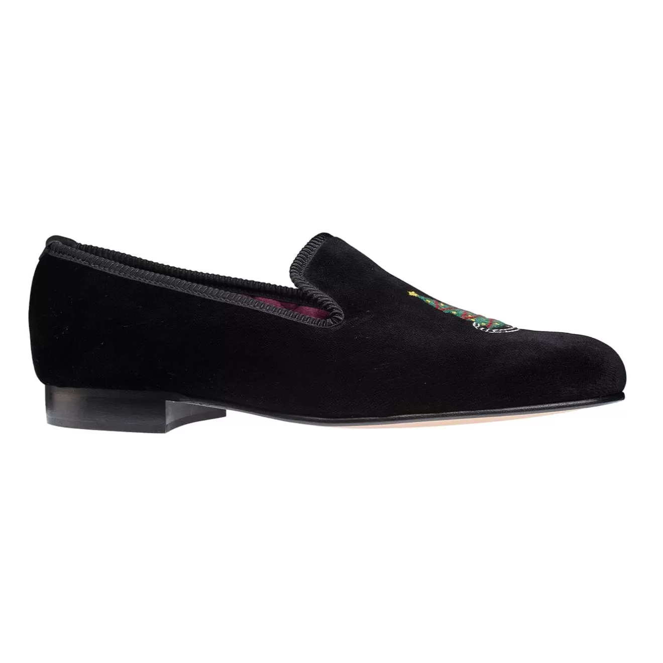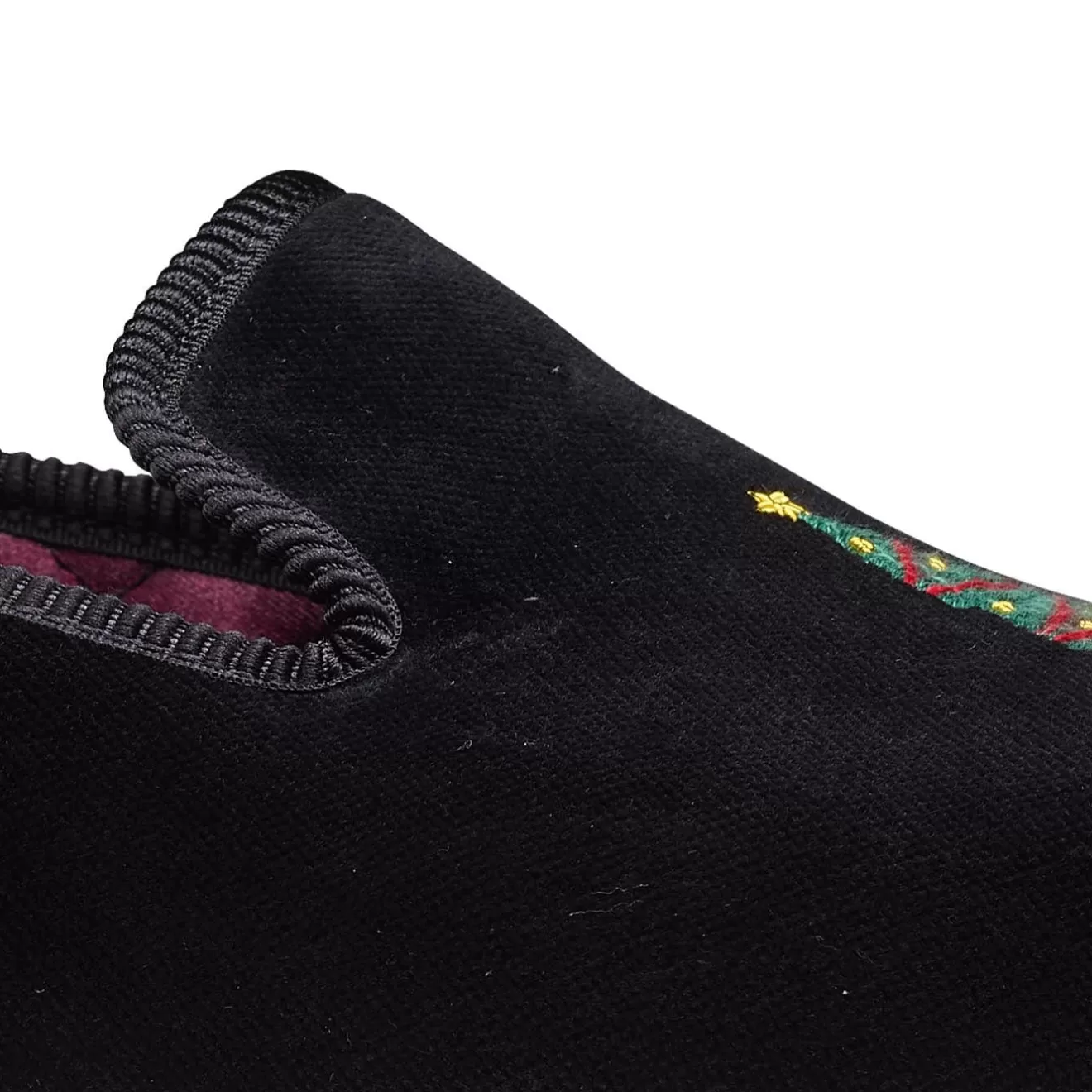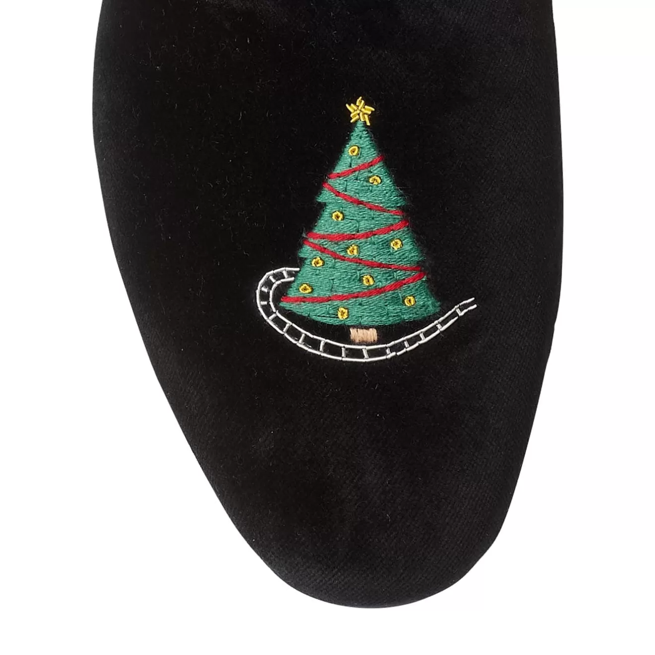 Christmas Tree, a house slipper with embroidery design made from soft black velvet with satin quilted linings and hard leather soles. From the Men’s Main Collection.