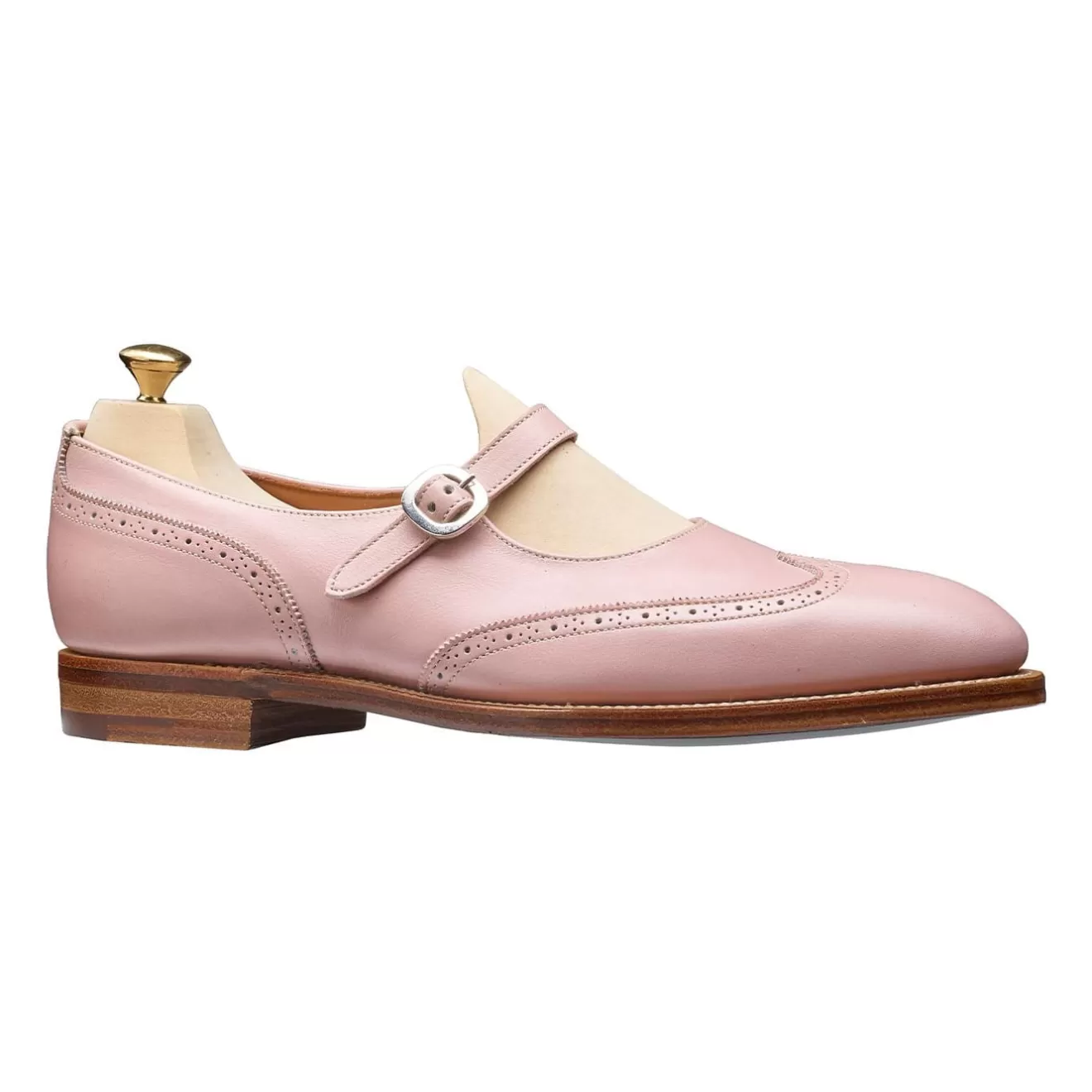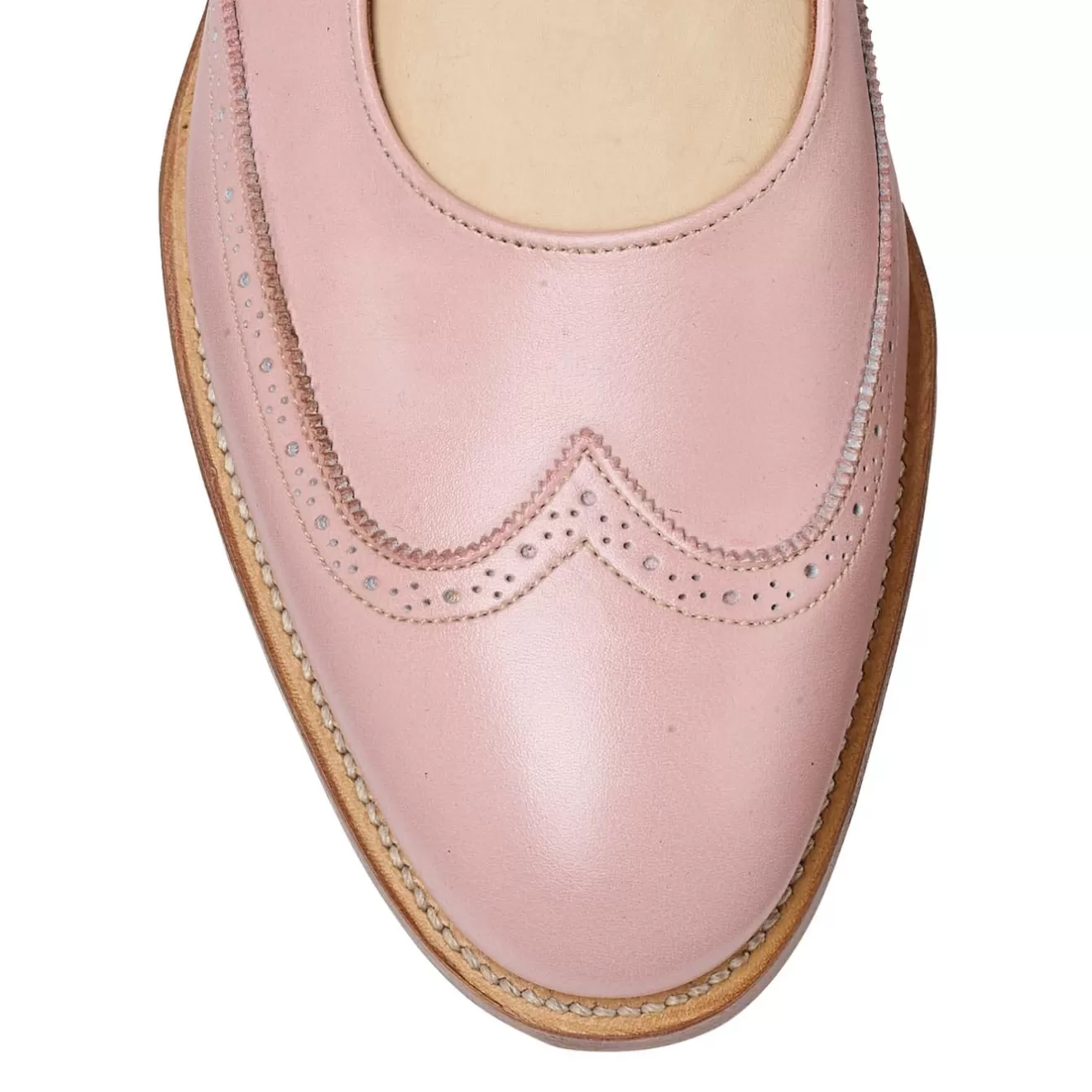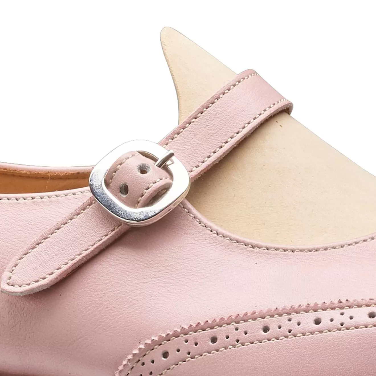 Mary, a single buckle Mary Jane style with a brogue wing tip design. Made from the finest blush pink calf leather with single leather soles. From the Women’s Collection.
