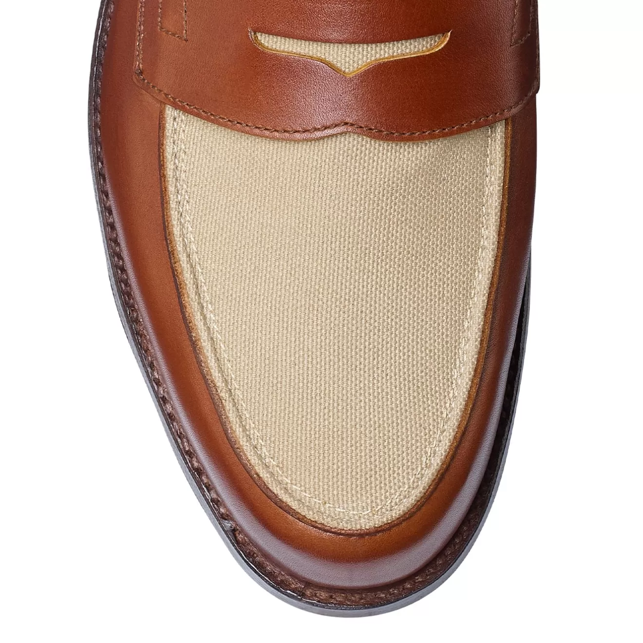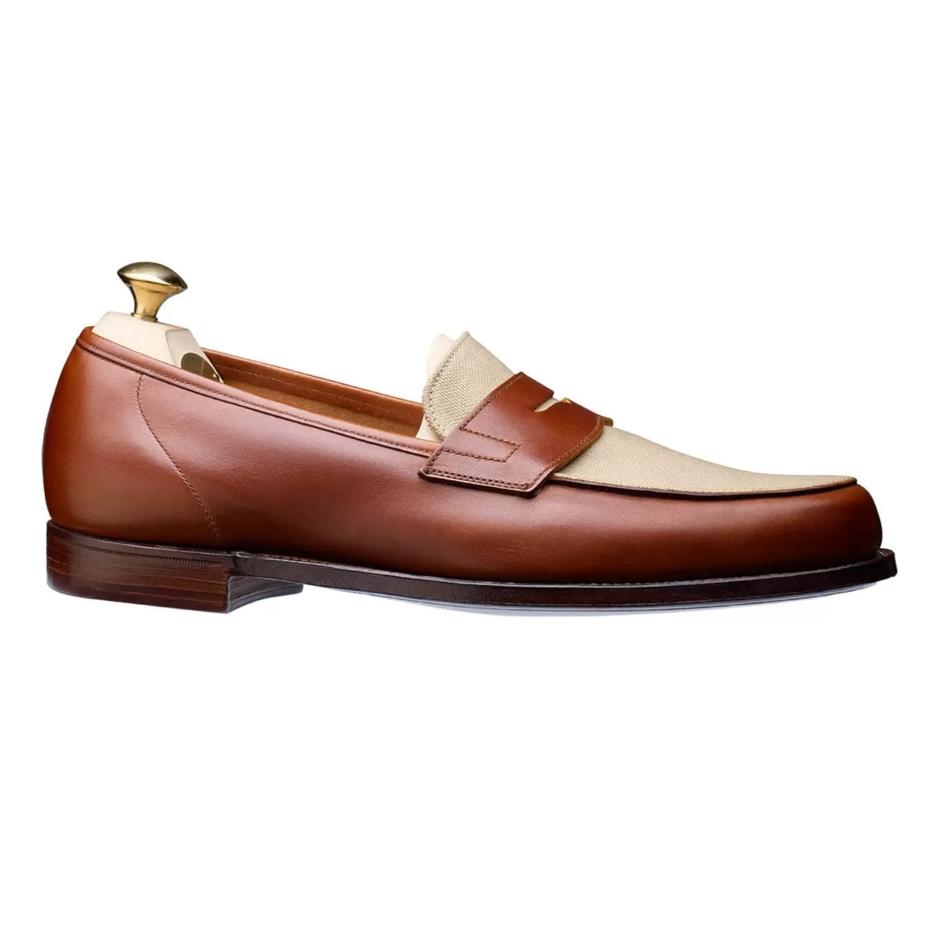 Richmond 2, a classic penny loafer with raised seam apron, our unlined version of GRANTHAM 2. Made from the finest tan calf leather & stone canvas combination featuring our SUPERFLEX leather sole. From the Men’s Main Collection.