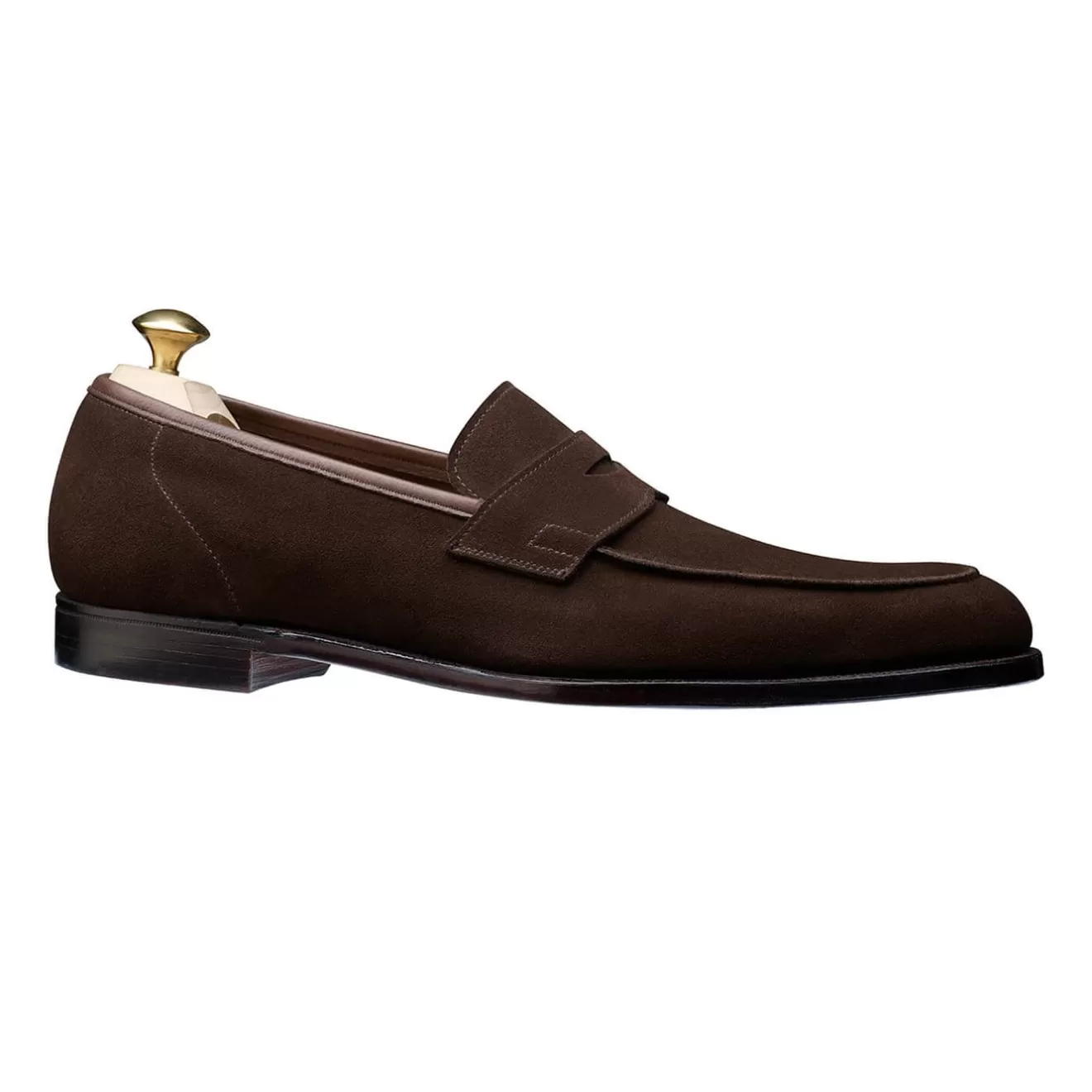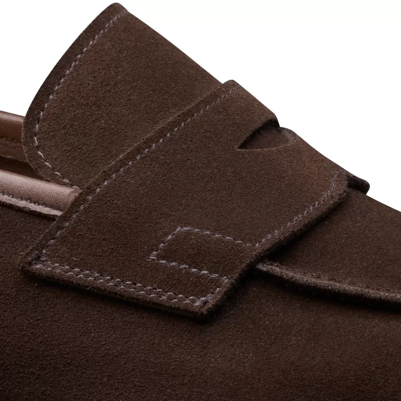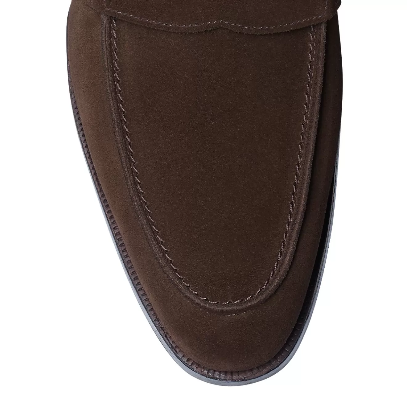 Cadogan, an unlined penny loafer made from the finest dark brown calf suede with bark tanned single leather soles. From the Hand Grade collection.