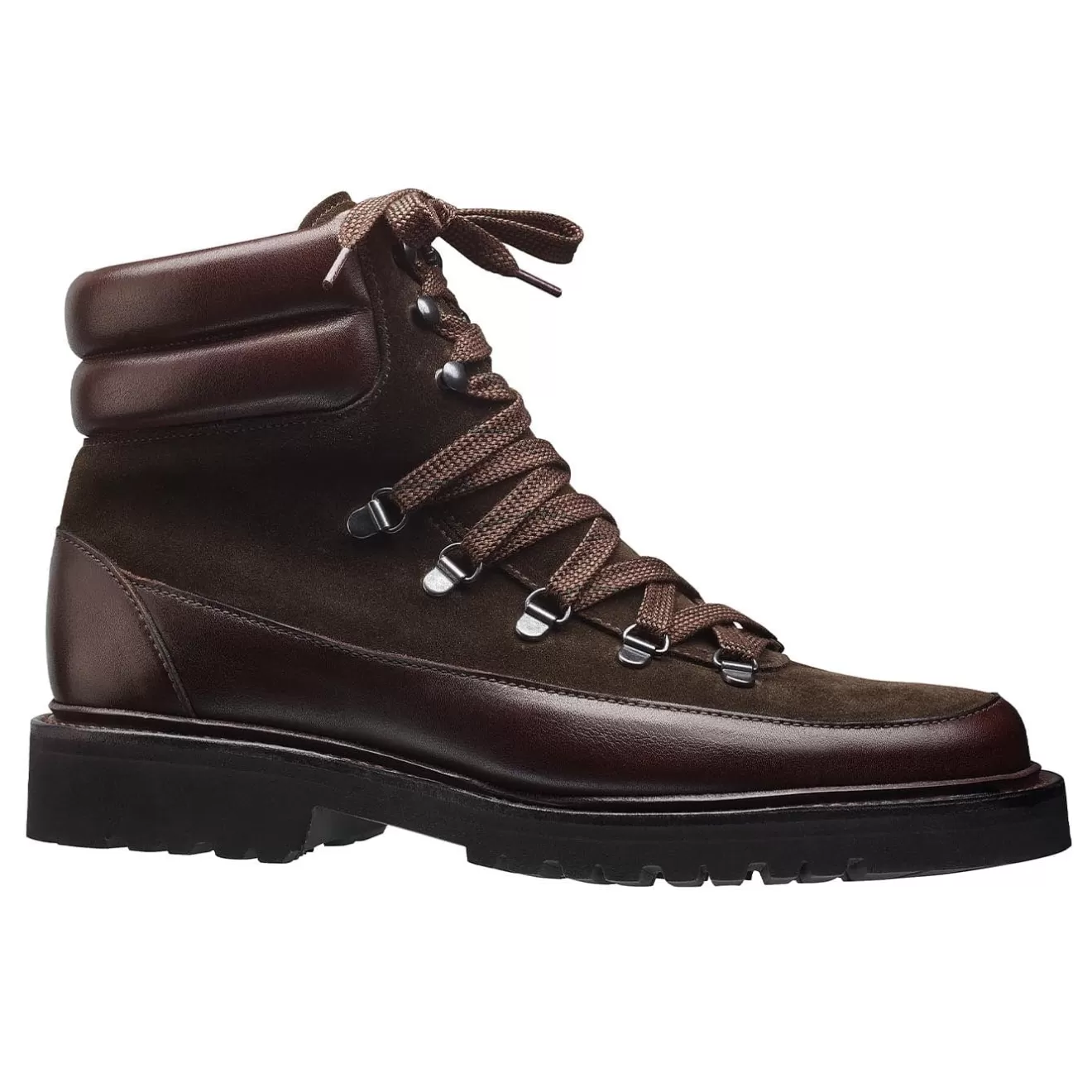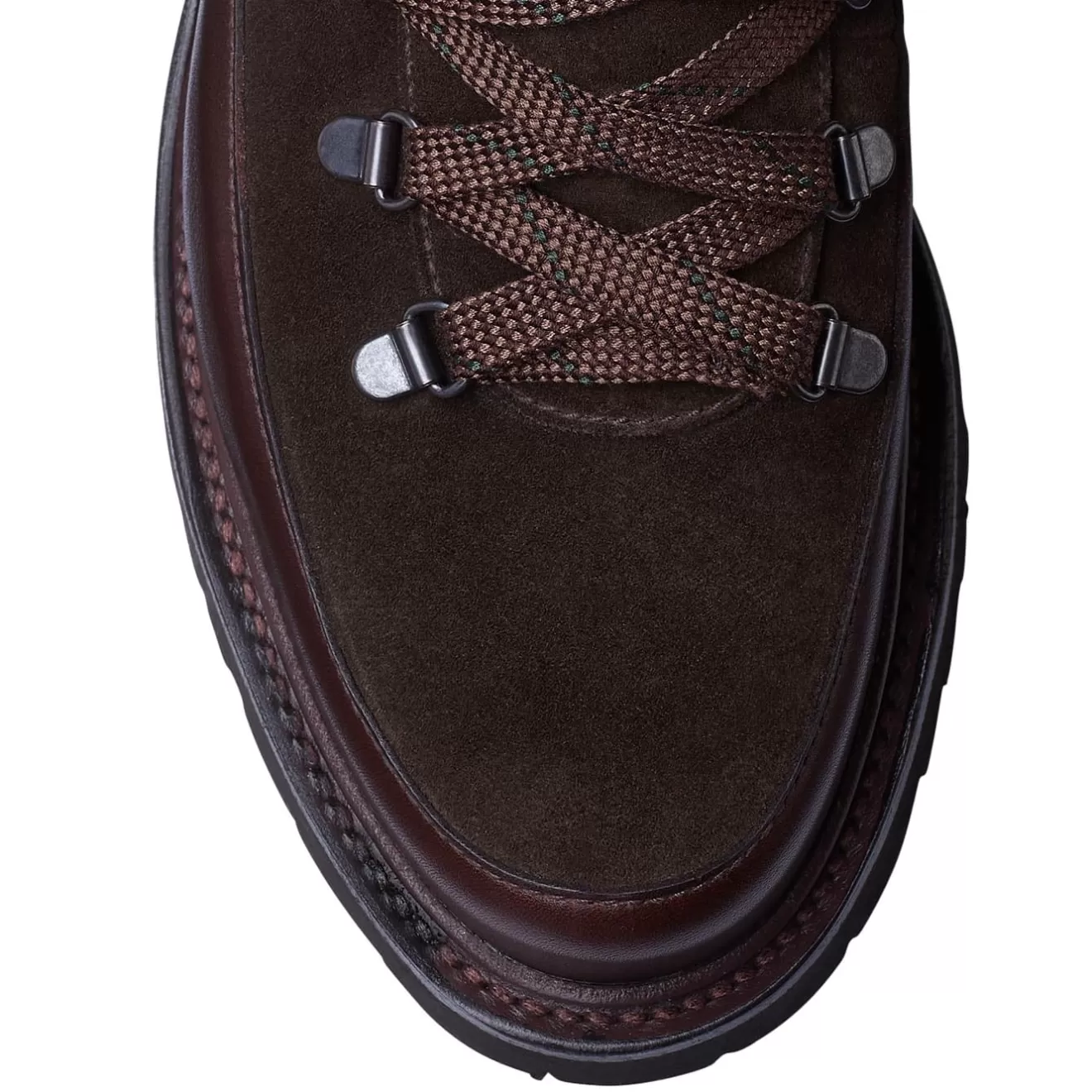 Annie, a hiking inspired derby boot with contrasting lacing and padded collar for comfort. Made from the finest dark brown wax calf and earth green suede with a chunky lightweight Vibram cleated sole. From the women’s collection.