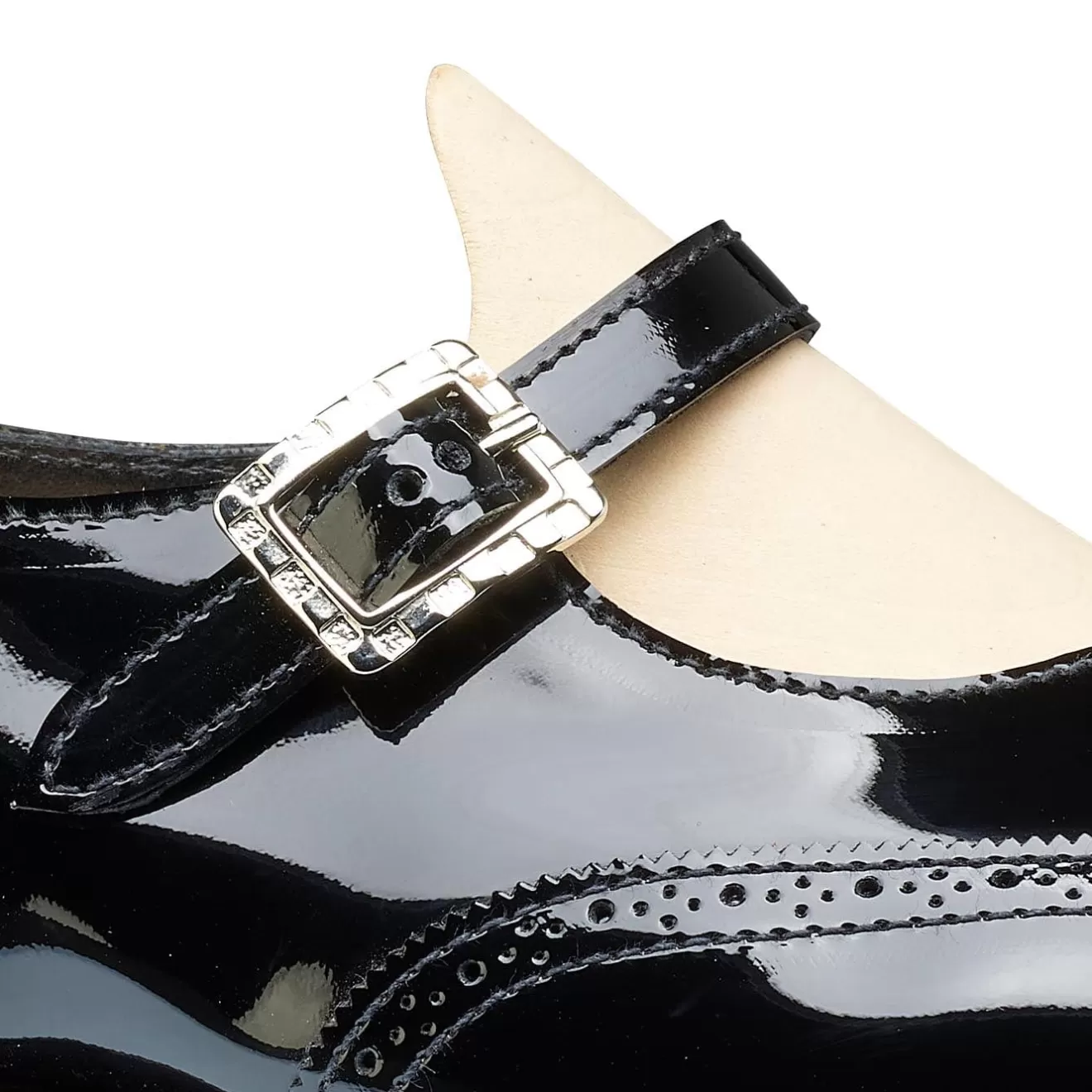 Mary, a single buckle Mary Jane style with a brogue wing tip design. Made from the finest black patent with single leather soles. From the Women’s Collection.