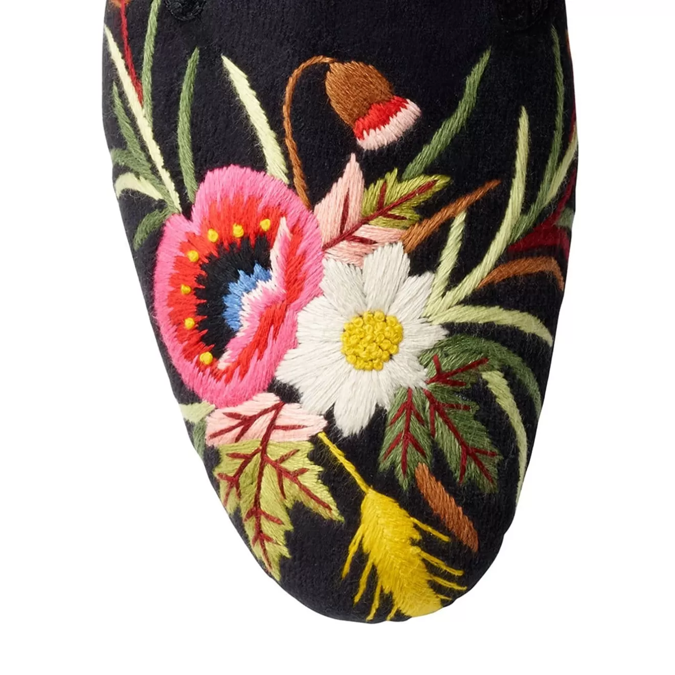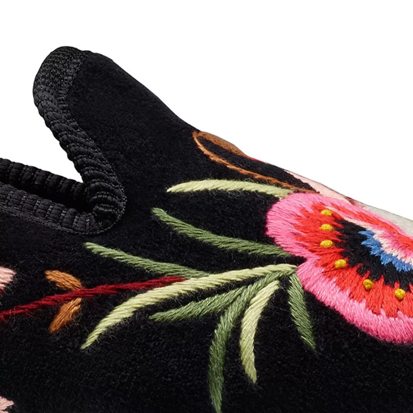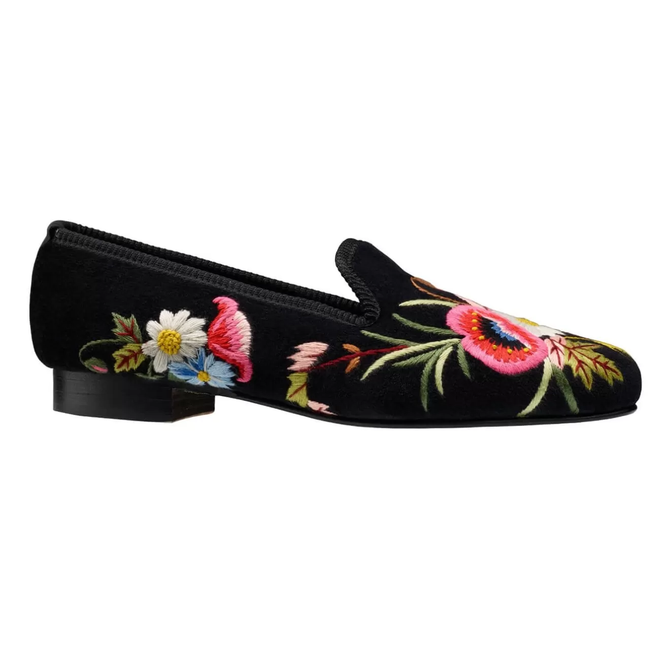 Poppies, a house slipper with elaborate embroidery design made from soft black velvet, satin quilted linings and hard leather soles. From the Women’s Collection.